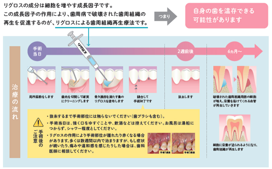 歯周病が進むと骨が失われ、抜歯になる可能性が高まります。リグロスとは歯周病で失われた骨を再生する薬です。